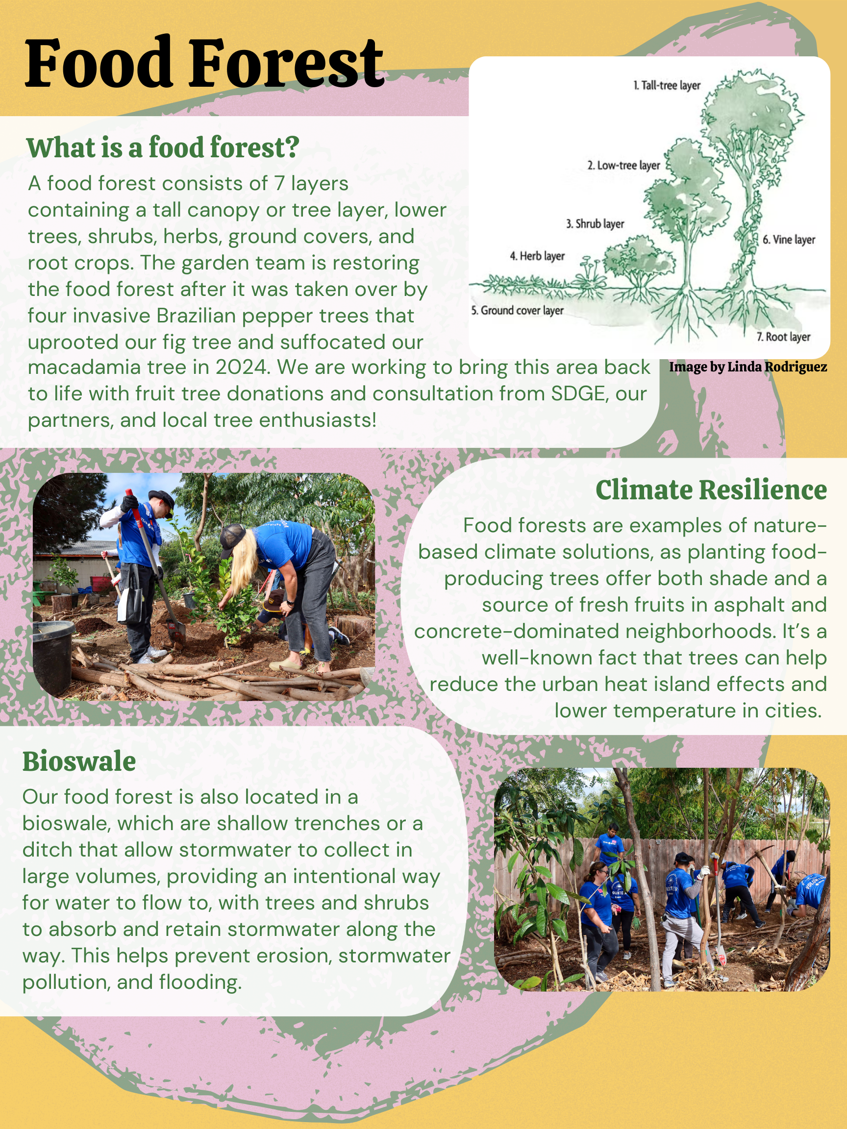 A food forest consists of 7 layers containing a tall canopy or tree layer, lower trees, shrubs, herbs, ground covers, and root crops. The garden team is rehabilitating the food forest after it was taken over by four invasive Brazilian pepper trees that uprooted our fig tree and suffocated our macadamia tree in 2024. We are working to bring this area back to life with the tree donations and advisory from our partner organizations.