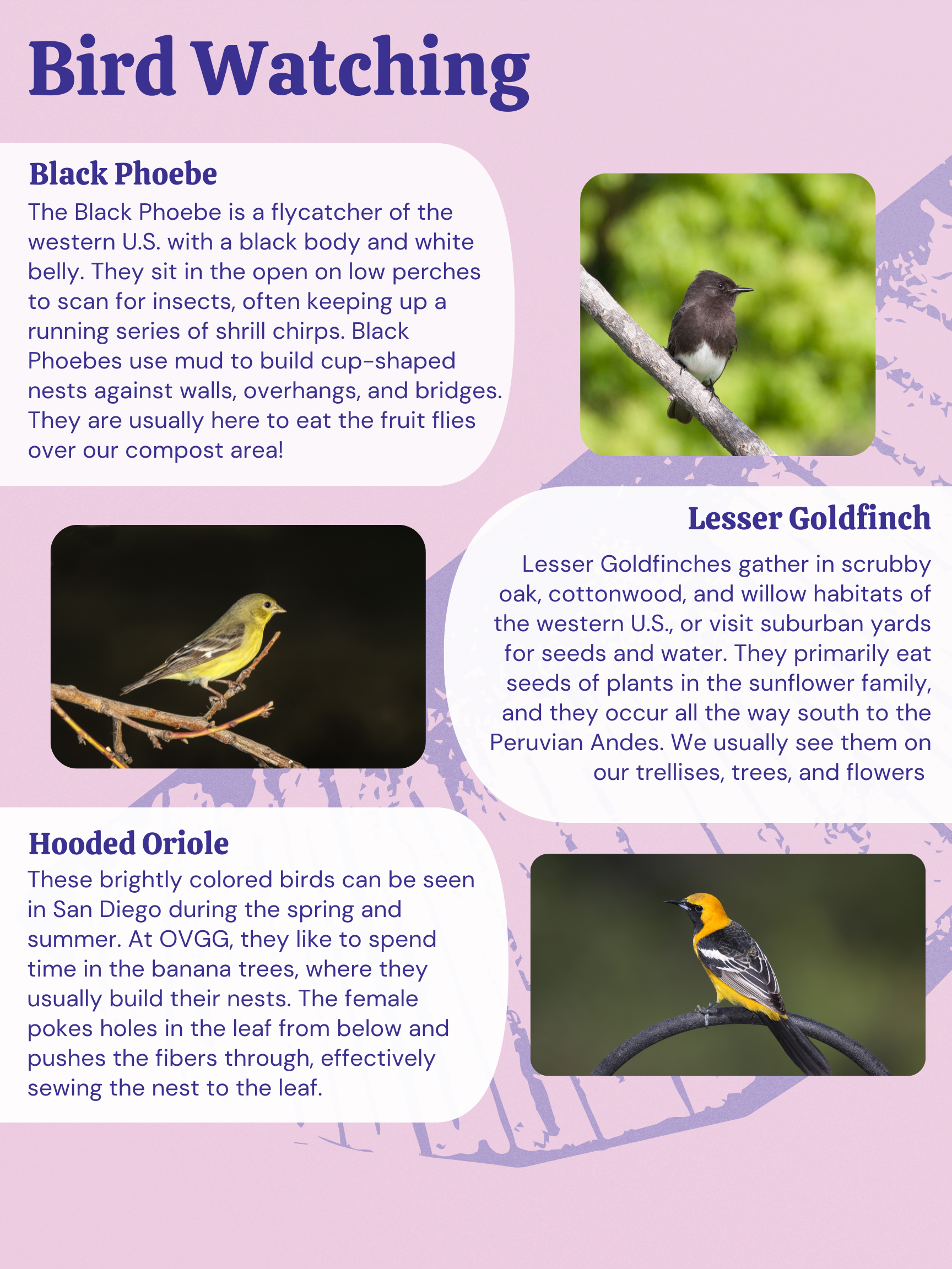 Birds are an important part of our ecosystem they help pollinate, disperse seeds, act as natural pest controllers eating caterpillars and such. Many different birds can be spotted in San Diego!