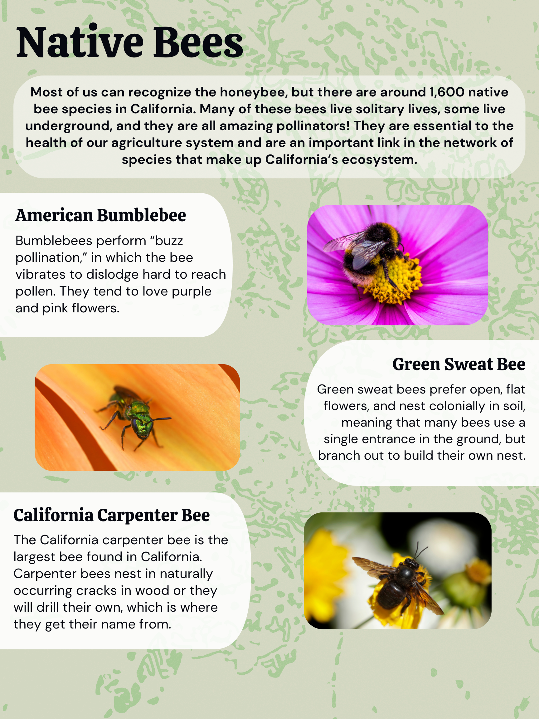 Most of us can recognize the honeybee, but there are around 1,600 native bee species in California. Many of these bees live solitary lives, some live underground, and they are all amazing pollinators! They are essential to the health of our agriculture system, and are an importnat link in the network of species that make up California’s ecosystem.