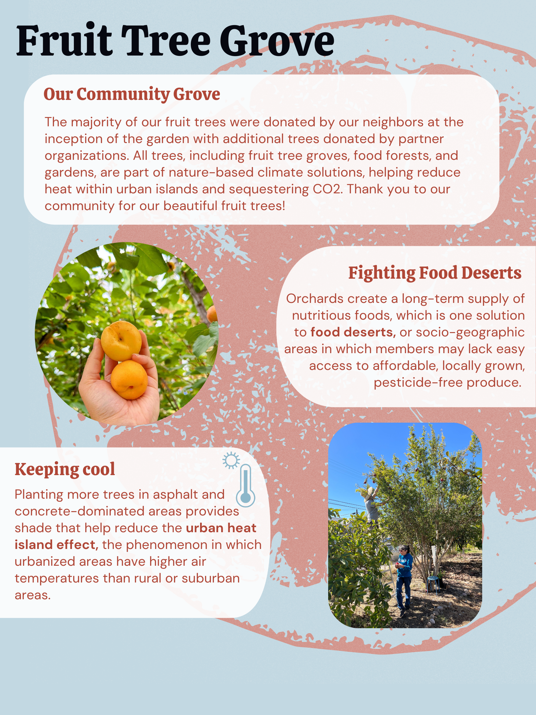 The majority of our fruit trees were donated by our neighbors at the inception of the garden with additional trees donated by partner organizations. All trees, including fruit tree groves, food forests, and gardens, are part of nature-based climate solutions, helping reduce heat within urban islands and sequestering CO2. Thank you to our community for our beautiful fruit trees!