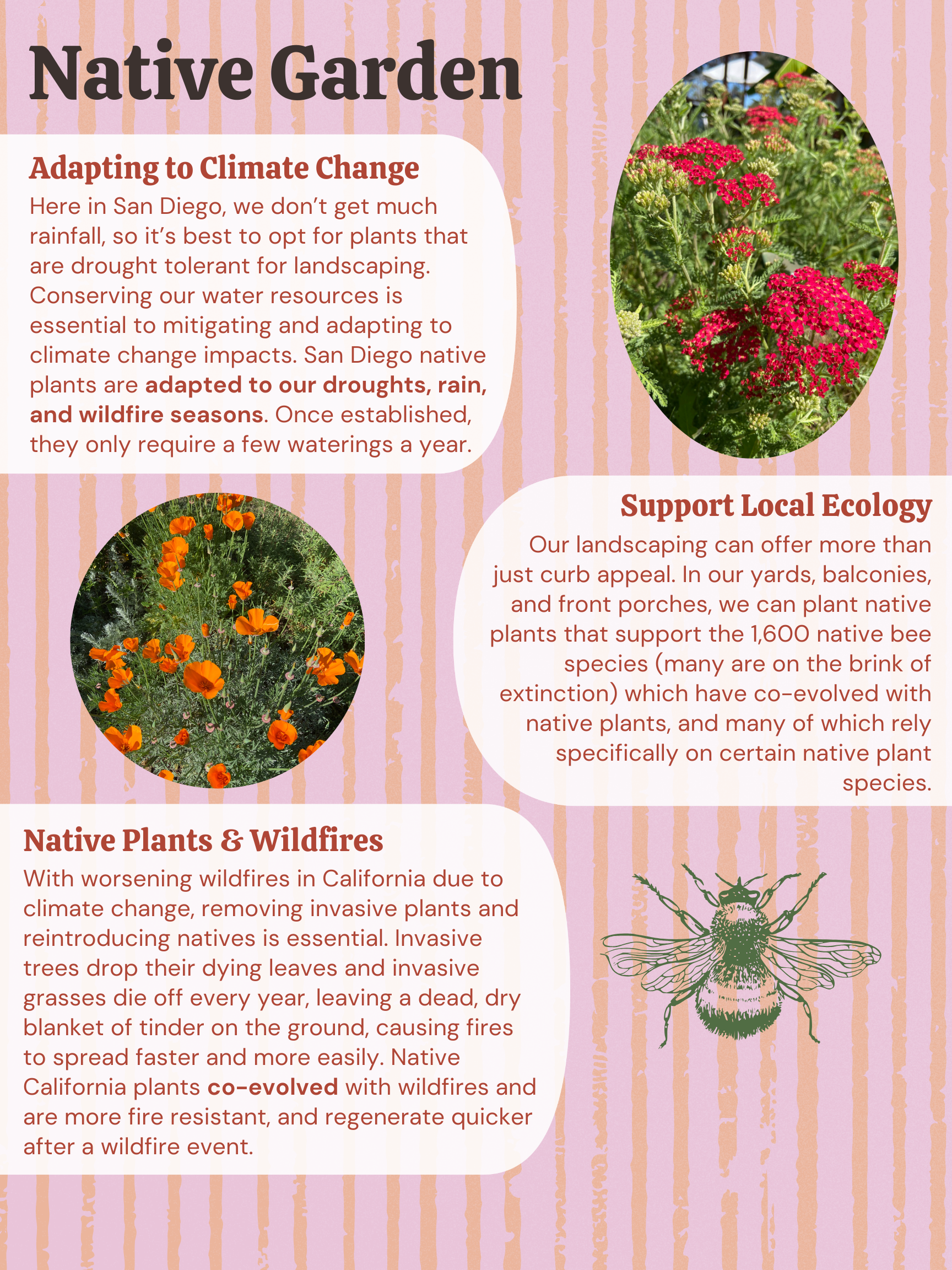 Here in San Diego, we do not get much rainfall, so it is best to opt for plants that are drought tolerant. Conserving our water resources is essential to mitigating and adapting to climate change impacts. Native plants also help support our local ecology, by providing habitat and food for native insects and animals.