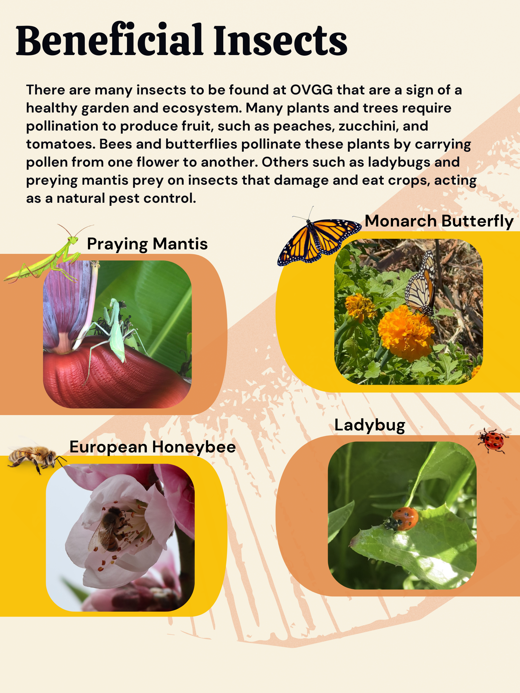 There are many insects to be found at OVGG that are a sign of a healthy garden. Some of these insects help to pollinate plants and trees that produce fruit and need the assitance of bees and butterflies to transfer pollen from flower to flower. Others such as ladybugs and preying mantis prey on insects that damage and eat crops, acting as a natural pest control.